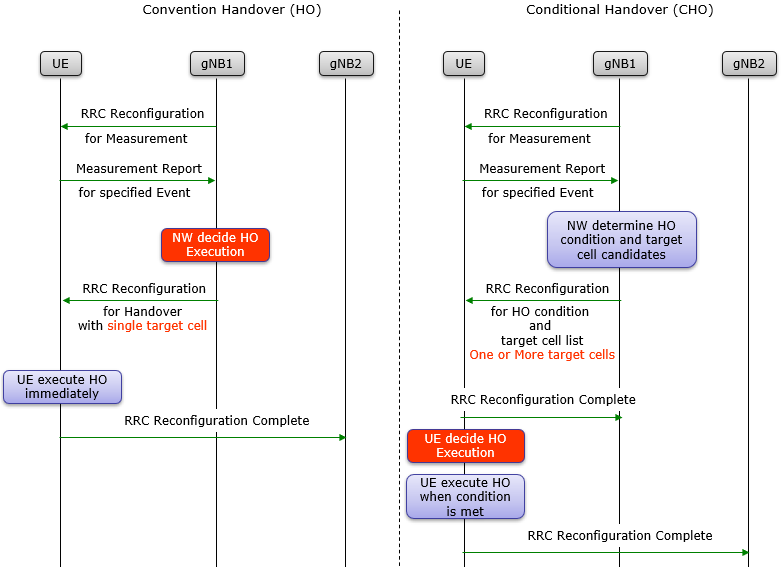 The result is that conventional handover provides tight network control and simpler resource handling but can be vulnerable to delay and failure in fast mobility. Conditional handover increases execution flexibility and reliability in high-mobility or uncertain radio conditions but requires more preparation and context management at the network side. The most fundamental difference is simple: in conventional handover, the network decides when to execute. In conditional handover, the UE decides
