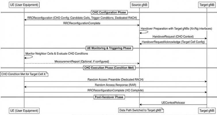 - Autonomous Monitoring: UE continuously monitors neighbor cells and evaluates CHO conditions.