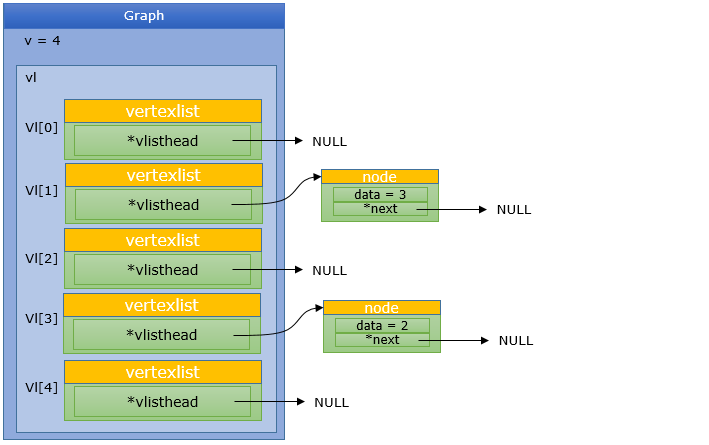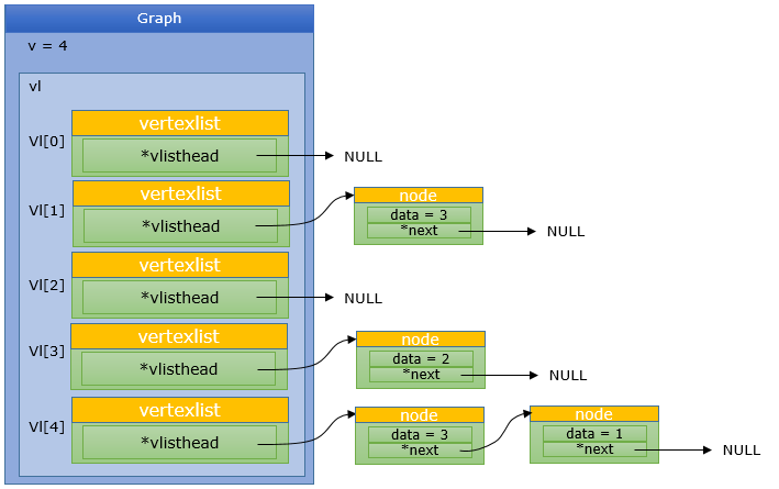 // A structure to store the graph vertexes. This will store an Array // and each element of the array will point to the head of a linked list typedef struct GRAPH { int v; vertexlist *vl; } Graph;