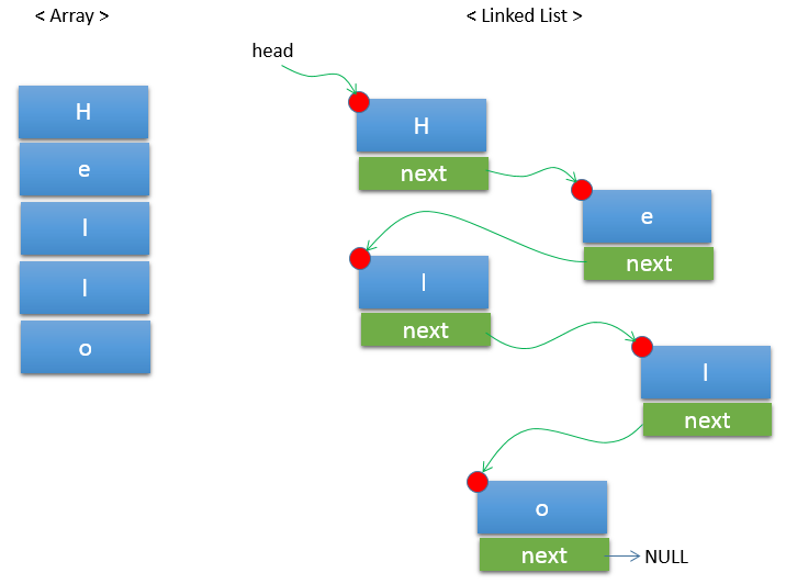 Linked List is a kind of data structure that is designed to store multiple elements in a single variable. In terms of the purpose, you may think it is similar to an Array. But there is difference between an Array and LinkedList in terms of implementation. The biggest difference can be illustrated as below. In an array, the program allocate a consecutive memory blocks to store the items, but in linked list the location of each items may be scattered around here and there. Another difference is .. when you define an array, you should know the size of memory (the number of the elements) when you declair the variable, but in linked list you don't have to know this when you create the list. You would add or delete memory space as it is necessary.