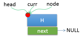 Now we see following line. With this, all the three pointer variables (head, curr, node) points to the same location of the memory as shown below.
