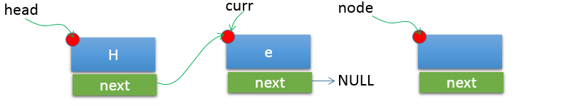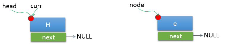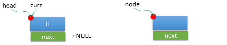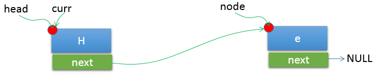 Now we get a very important step. This means let the next element of curr block points to the memory block 'node'. By this step, the two memory blocks get connected (linked) as shown below.