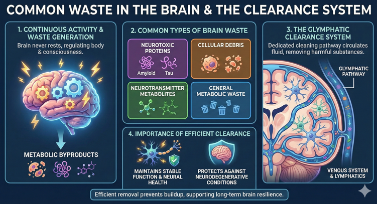 The brain must remove these materials efficiently. If not, the waste would interfere with neural activity. It could slow signal transmission, disrupt homeostasis, or even push the system toward disease. For this reason, the brain uses a dedicated clearance network. This network is called the glymphatic system. It acts as the brain’s cleaning pathway. It circulates fluid, washes out waste, and moves harmful substances toward areas where they can be removed. This waste-clearance process is critical. It helps the brain maintain stable function. It supports long-term health of neurons. It also protects the brain from neurodegenerative conditions linked to waste buildup. Understanding these waste types and how they are cleared helps you see how the brain sustains its efficiency and preserves its overall resilience.