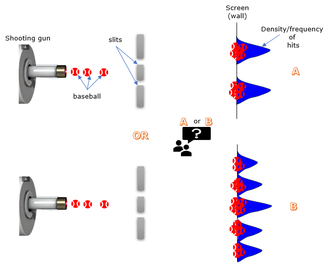 Click the "Reset All" button to return all parameters to their default values and clear the current results. Primer before the experimentBefore jumping directly into the details of the double slit experiment, I want to set some baseline to trigger some questions in your mind. Imagine you're at a baseball game, but instead of a batter at home plate, there's a pitching machine firing off hundreds of baseballs towards a wall with two narrow slits. Those balls that don't smash into the wall sail through the slits and land on a big screen behind it. Now, imagine carefully marking where each ball lands on that screen. What kind of pattern do you think you'd see? Take a look at the two pictures below – would the marks on the screen look more like Case A or Case B?"