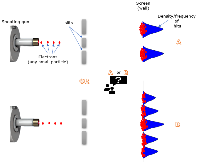 Let's rewind that scene at the ballpark. The pitching machine is still there, but instead of hurling baseballs, it's now firing a stream of electrons towards the wall with the two slits. These electrons are incredibly tiny – way smaller than even the tiniest speck of dust you can imagine. After a while of shooting game, Which one do you think better represents the pattern those electrons would make on the screen? A or B.