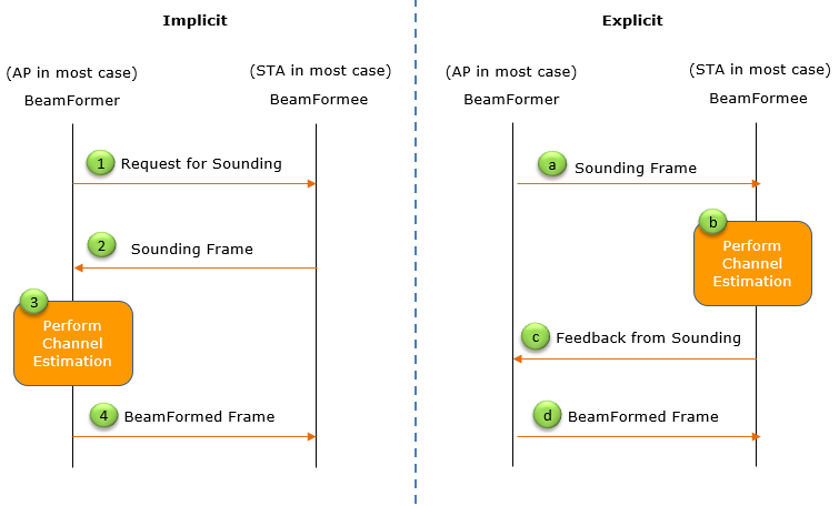 How to perform BeamForming in WiFi protcol ?Now we know what is the beamforming and why we want to use the technique. Then a question arises. How the transmitter (BeamFormer) wants to know which direction it should point the beam to ? If the location of the transmitter and reciever is fixed, the determining the beam direction would be simple. You just point the antenna of transmitter and reciever in such a way that they are aligned in line of sight at the time of installation (Most of satellite communication or microwave link determine the beam direction in this way). However, in case of WiFi the position of AP and Station, especially the position of Stations changes very frequently. So a working beam direction now would not work in a few minutes later. It mean that there should be some mechanism by which the BeamFormer figure out the proper direction of the beam dynamically. This kind of Dynamic mechanism is implemented as a protocol in 802.11. There are two types of beamforming process, called Implicit and Explicit process.