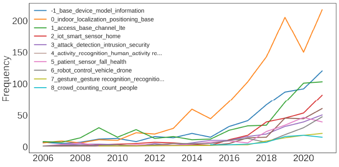 - Human Activity Recognition: The frequency of this topic has risen sharply in the latter half of the observed period, which could be due to advancements in using Wi-Fi signals for monitoring and recognizing human activities.