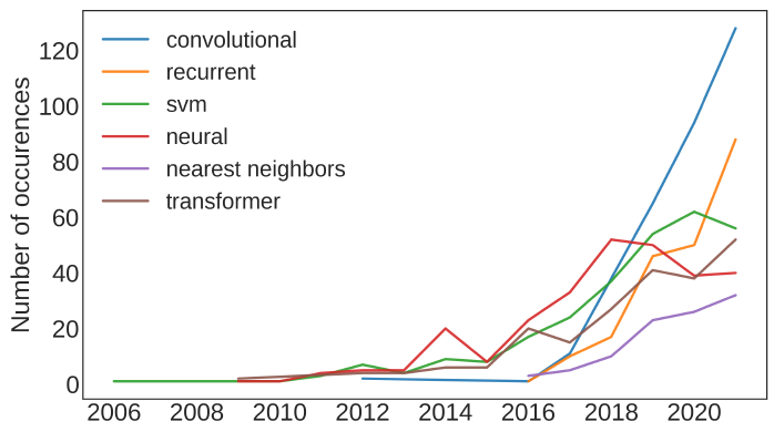 There is a plot from the paper that I want to share in this note. The plot is a graphical representation of the usage over time of different machine learning (ML) models in the context of Wi-Fi related research. It shows the number of occurrences (i.e., the frequency of mentions or use) of various ML models in academic papers or projects from 2006 to early 2020s