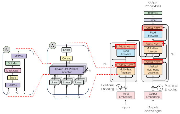 In the overall transformer architecture, this tutorial will cover the blocks highligned in the red box as shown below.