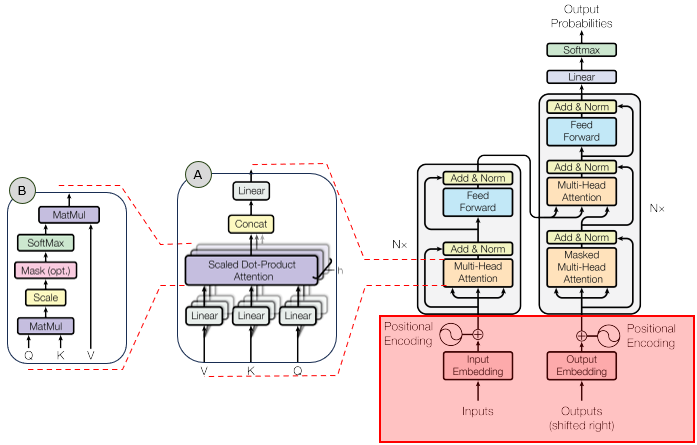In the overall transformer architecture, this tutorial will cover the blocks highligned in the red box as shown below.