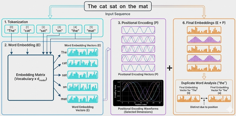 NOTE : This tutorial provides a visual, interactive exploration of Transformer input embeddings and positional encoding. The key insight is that Transformers need positional encoding because they process sequences in parallel (unlike RNNs which process sequentially). Without positional encoding, the model cannot distinguish word order - "the" at position 0 and "the" at position 4 would be identical. The sinusoidal positional encoding uses sine and cosine functions at different frequencies to create unique "fingerprints" for each position. The formula PE(pos, 2i) = sin(pos / 100002i/d_model) and PE(pos, 2i+1) = cos(pos / 100002i/d_model) creates different frequencies for different dimensions, ensuring each position has a unique encoding pattern. The tutorial demonstrates this through interactive heatmaps showing word embeddings (E), positional encodings (P), and final embeddings (E + P), plus a waveform chart showing the sine/cosine patterns. The "the" test with cosine similarity analysis (comparing "the" at positions 0 and 4 in "The cat sat on the mat") provides mathematical proof that positional encoding makes position-dependent representations. The adjustable embedding dimension (d_model) slider allows experimentation with different vector sizes, though real Transformers use d_model = 512 or higher. This tutorial uses simplified tokenization (whitespace-based) and random word embeddings for demonstration - real Transformers use learned embeddings and sophisticated tokenization. The core concept remains the same: positional encoding is essential for Transformers to understand word order, and the sinusoidal approach provides a mathematically elegant solution that can extrapolate to longer sequences and provides interpretable frequency patterns.