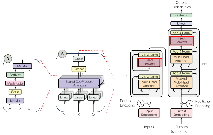 In the overall transformer architecture, this tutorial will cover the blocks highligned in the red box as shown below.