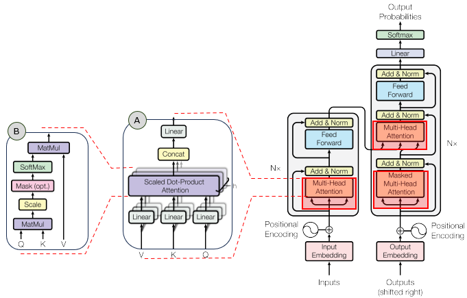 In the overall transformer architecture, this tutorial will cover the blocks highligned in the red box as shown below.