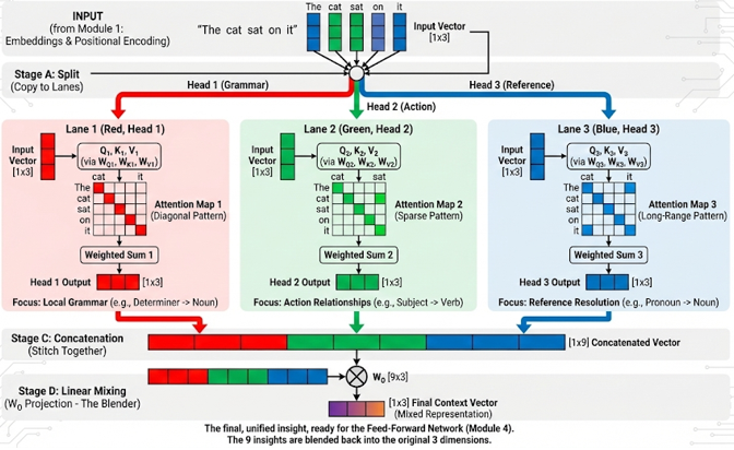 Stage C: Parallel Attention Maps (Each Head = Mini Module 2): The third visualization shows 3 attention heatmaps side by side. Inside each colored lane, the entire Module 2 "Filing System" process is happening:
